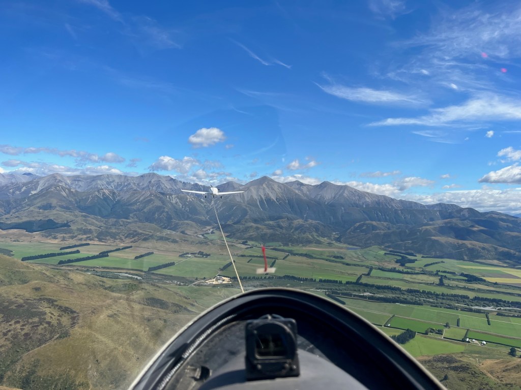 Just 20 minutes from our home is the Canterbury Gliding Club which keeps several 2-seater gliders for rides and instruction. After several delays because of unfavorable weather, I had a perfect morning for my flight. The pictures show (1) me standing along the wide winged craft which just happens to to be marked at the tail with my initials (2) me strapped in with parachute on my back used just for chair padding, I hope (3) just after take-off behind out toe plane (4) a typical vista over the nearby foothills as we aim for that wispy cloud just straight ahead which suggests an updraft beneath it. I had the controls for a few minutes coached closely from the back seat by pilot, Bruce. He has retired from flying 787’s going back to his roots of gliders he first experienced 50 years ago as a teen. It was exhilarating and relaxing at the same time and I may have to do this again. Dianne says she will pass on this activity.
