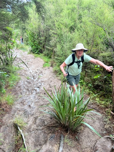 Dianne and I spent the afternoon on a trail called Washpen Falls 35 minutes away just off my favorite road, the Inland Scenic Highway. The dirt track was muddy after recent rains but Dianne led me safely to the falls. We finished in good shape though it did take 2 hours instead of the advertised 57 minutes. See the pictures below-good thing Dianne didn’t slip into the dense foliage as her green clothes could have made her hard to find.