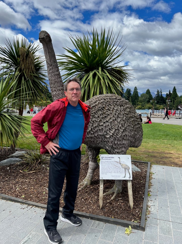 I learned the flightless New Zealand bird, the Moa was driven to extinction by humans just 600 years ago. They ranged in size from as small as turkeys or 2 meters high as depicted in the sculpture. Because they were tasty to humans, the “moa is no moa”