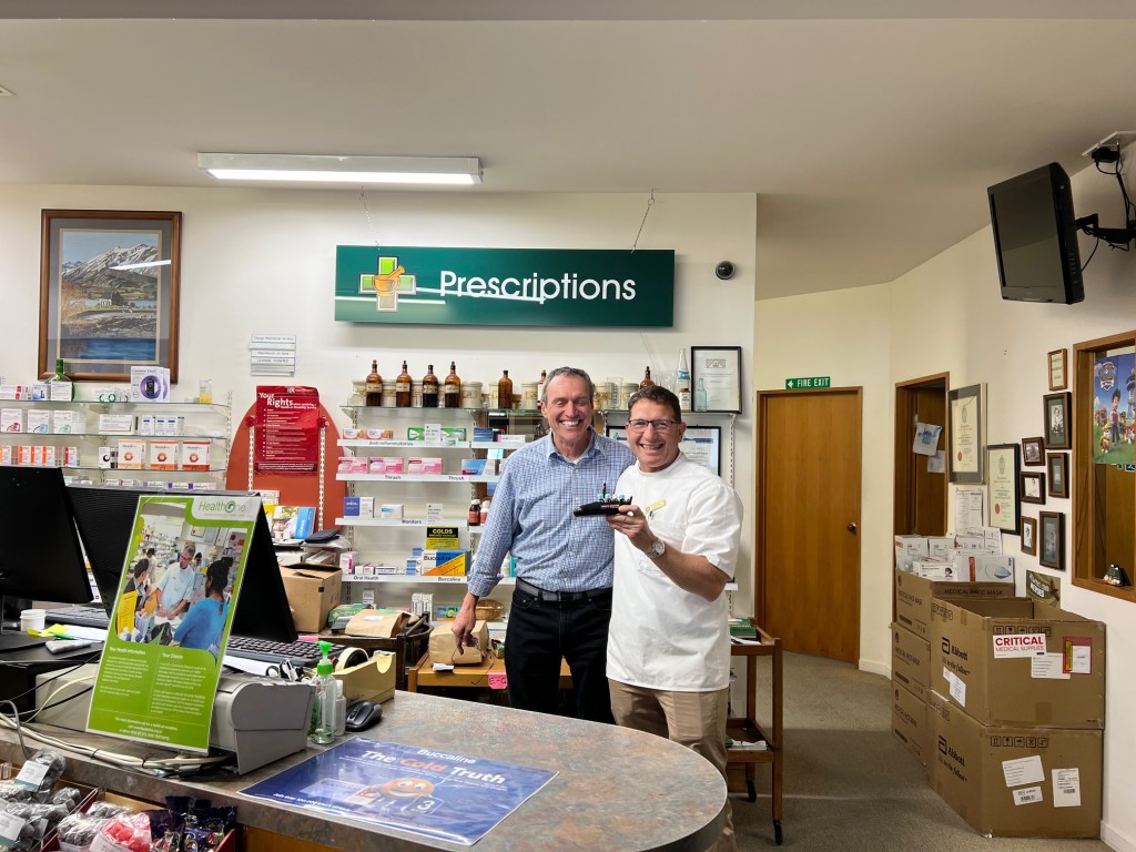 I had not realized what a local legend the pharmacist (chemist) owner is until a patient told me that he was on the 2006 New Zealand Olympic bobsled team. His business is the lone drugstore here in Darfield and fills 95% of the meds I prescribe. A visit to his place of work and I learned he had been the brakeman for the 4 man team but was moved to the third seat for strategic reasons just before competing in Turin, Italy. In the picture below you see me with Aaron who is holding a model bobsleigh, as they say here.